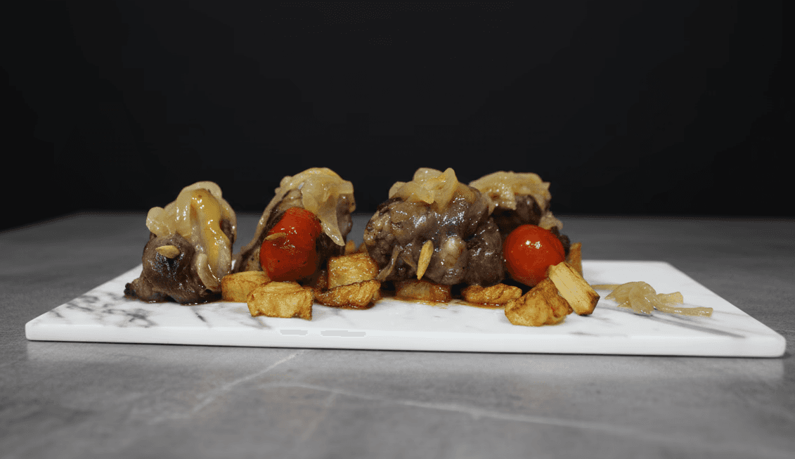 Cuatro pinchos de Entraña, rellenos de Bacon, Tocino bérico, Tomate Cherry y Cebolla caramelizada acompañado con Mostaza miel en cama de Patatas Fritas