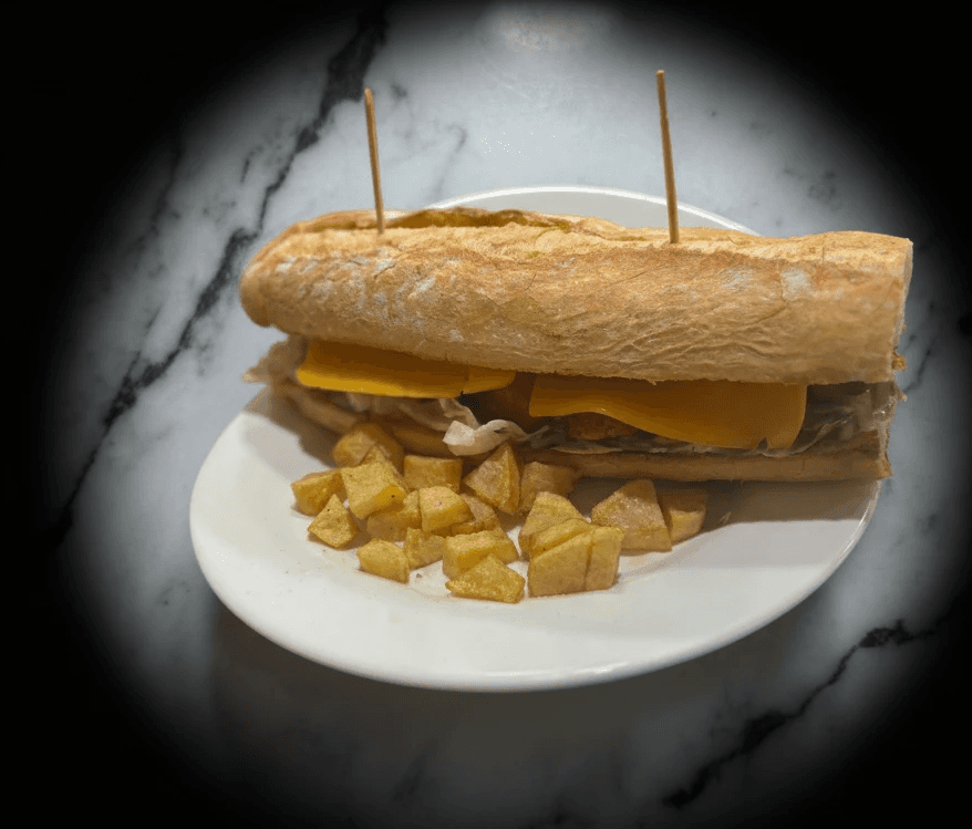 Jamón Ibérico, Rulo de Cabra y Cebolla caramelizada con Patatas Fritas