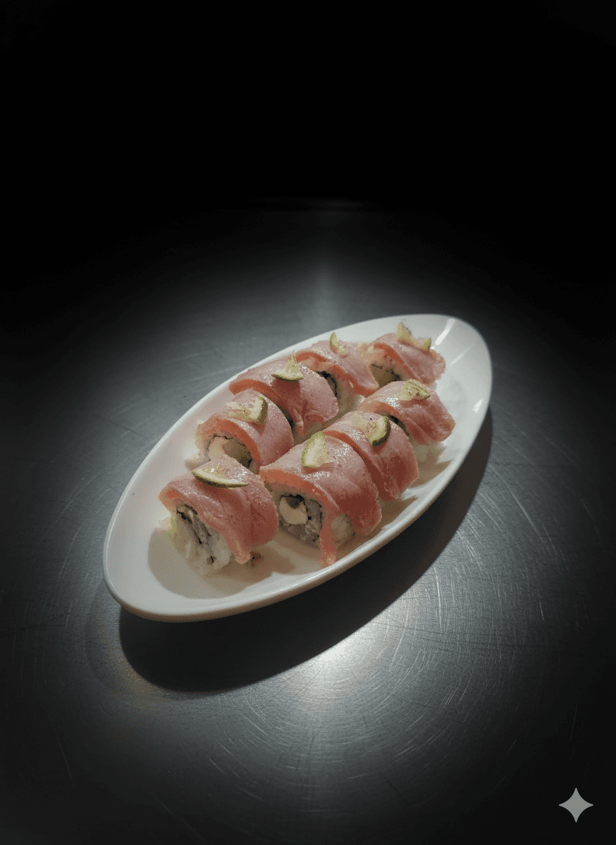 Aguacate, Queso Crema, Alga, Arroz, Topping de Lima y Atún flambeado marinado con Aceite de Sésamo