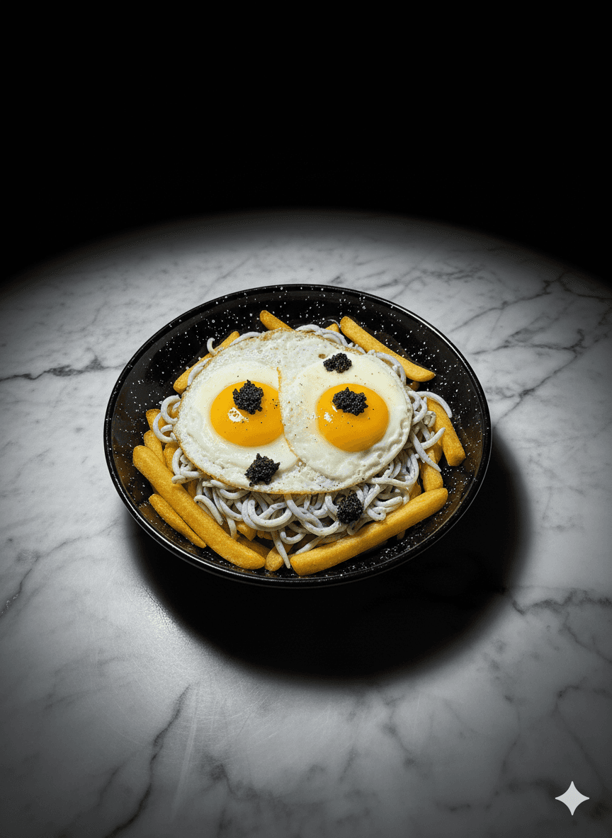 Huevos fritos, Gulas y Trufa con Patatas fritas