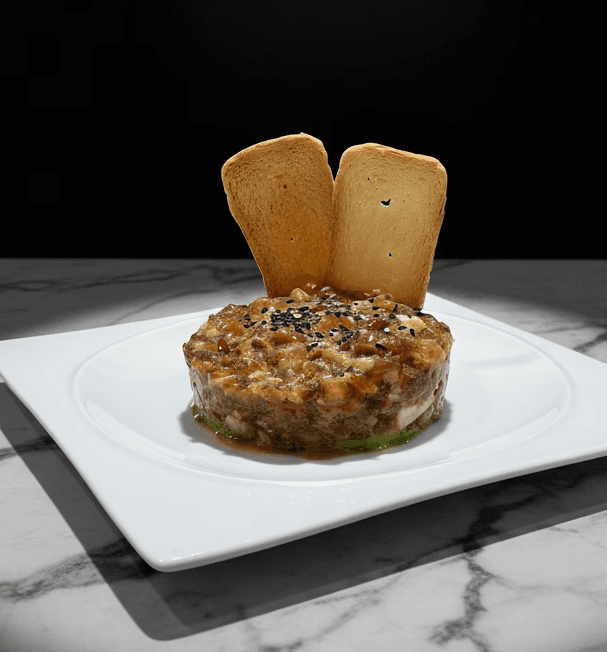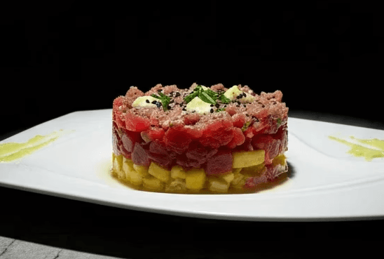 Atún en base de Melocotón, Aguacate y Tomate Aliñado con Aceite de Sésamo y Lima, decorado con Lima Flambeada y Semillas de Sésamo