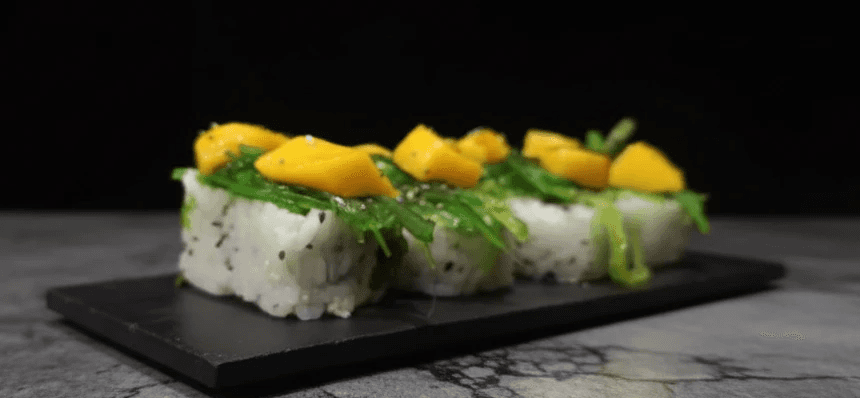 Queso Crema, Aguacate, Alga, Arroz, Sésamo, Wakame y Melocotón